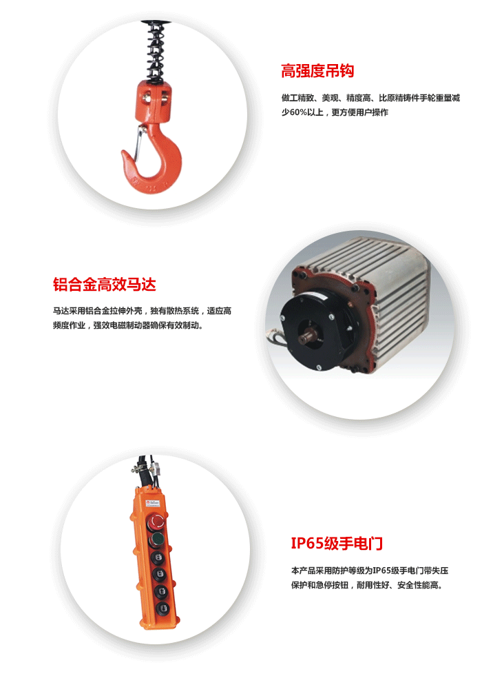 5、極限開關(guān):吊上吊下都有極限快關(guān)裝置,使電機自動停止,反防止鏈條超出,確保安全。