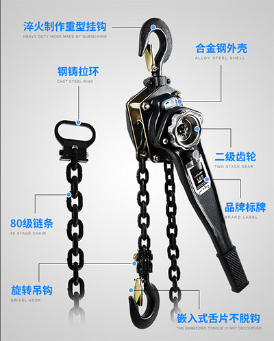 手板力小,堅(jiān)固耐用,工作省力,扎實(shí)做工。高強(qiáng)度韌性,加厚鋁合金吊鉤,安全不劃扣,整體式螺母,使用壽命長(zhǎng),合理設(shè)計(jì)卡槽,操作簡(jiǎn)單,人體工程學(xué)設(shè)計(jì)。結(jié)構(gòu):淬火制作重型掛鉤、合金鋼外殼、鋼鑄拉環(huán)、二級(jí)齒輪、80級(jí)鏈條、旋轉(zhuǎn)吊鉤、嵌入式舌片不脫鉤。