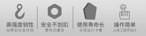 獨(dú)特的彈性離合器技術(shù),可在任意高度吊起貨物;輕盈的手拉裝置、起升率高;新型設(shè)計(jì)的鍛打式吊鉤,吊鉤頂端更為安全,且具有緩慢彎曲性能。
