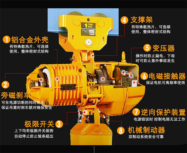 1、極限開關(guān):吊上吊下都有極限開關(guān)裝置,到達(dá)極限自動停止,防止鏈條超出。